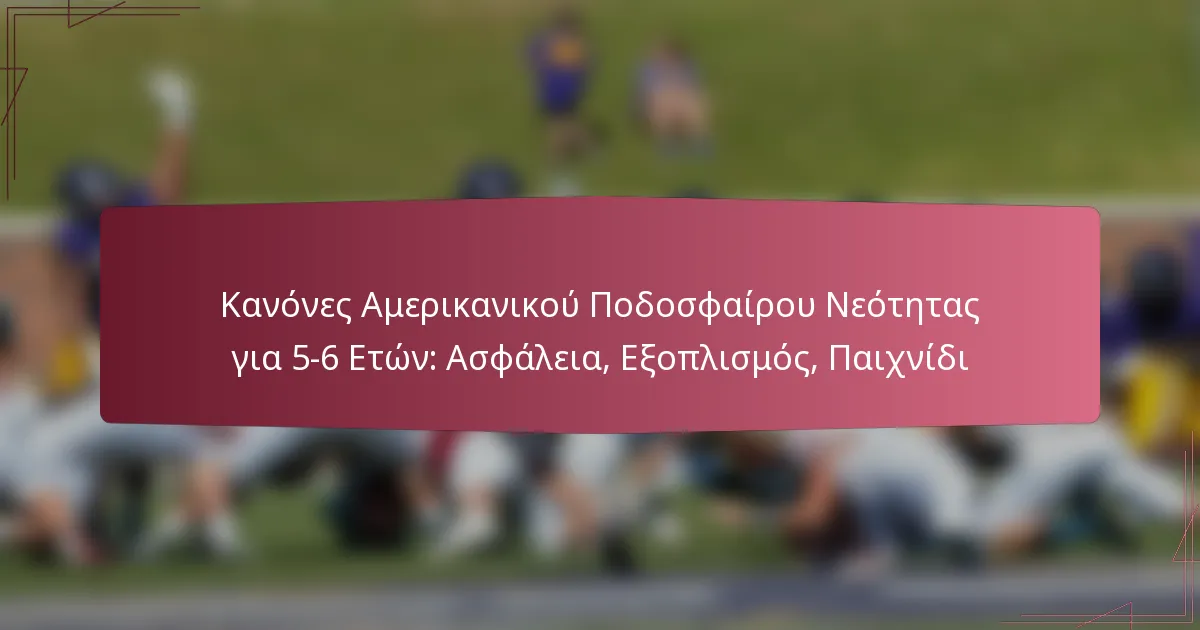 Το αμερικανικό ποδόσφαιρο για νέους ηλικίας 5-6 ετών δίνει προτεραιότητα στην ασφάλεια, εξασφαλίζοντας ένα ασφαλές περιβάλλον για τους νεαρούς παίκτες μέσω της πρόληψης τραυματισμών και της σωστής χρήσης εξοπλισμού. Ο απαραίτητος εξοπλισμός, συμπεριλαμβανομένων των κράνων και των επιγονατίδων, είναι κρίσιμος για την προστασία των συμμετεχόντων κατά τη διάρκεια του παιχνιδιού. Οι κανόνες έχουν σχεδιαστεί για να εισάγουν τα παιδιά στα θεμελιώδη του ποδοσφαίρου, ενώ τονίζουν την ανάπτυξη δεξιοτήτων, την ομαδικότητα και, το πιο σημαντικό, τη διασκέδαση.